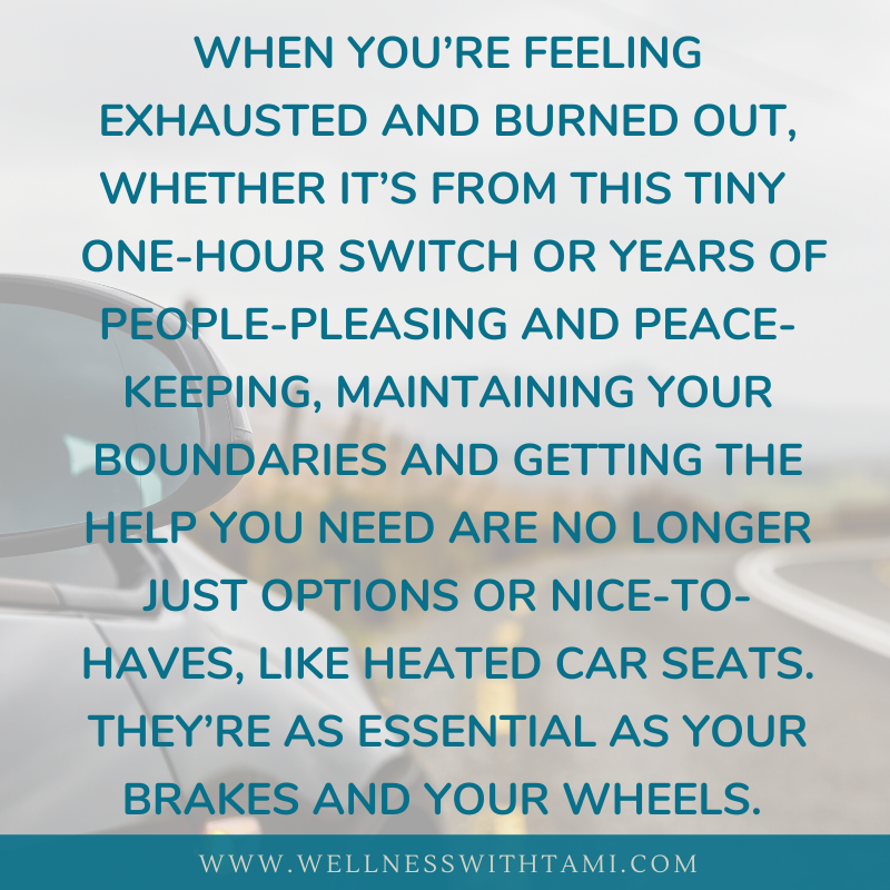 In over a decade of coaching, I’ve never met a client who couldn’t benefit from some work around setting boundaries and asking for help. When you’re feeling exhausted and burned out, whether it’s from this tiny one-hour switch or years of people-pleasing and peace-keeping, maintaining your boundaries and getting the help you need are no longer just options or nice-to-haves, like heated car seats. They’re as essential as your brakes and your wheels.